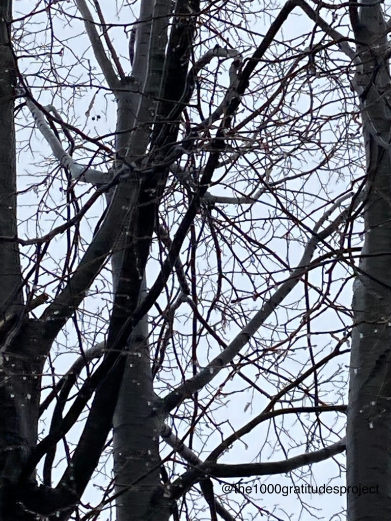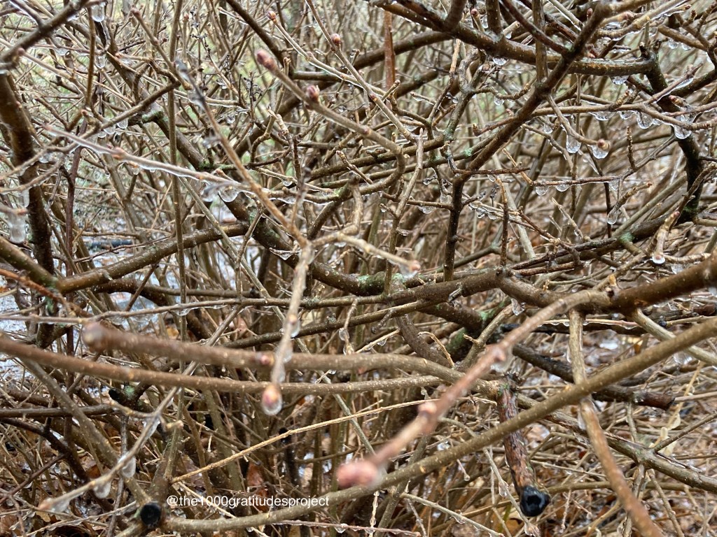 Among the 1000 gratitudes, I am surprised to report that today I am grateful for ice. Today was gloomy and wet and cold. I grumbled about taking the dog out early in the morning – but when I did, the lilac bush by our door was coated in ice – slick and shiny, as though the whole thing had been dipped in glass.