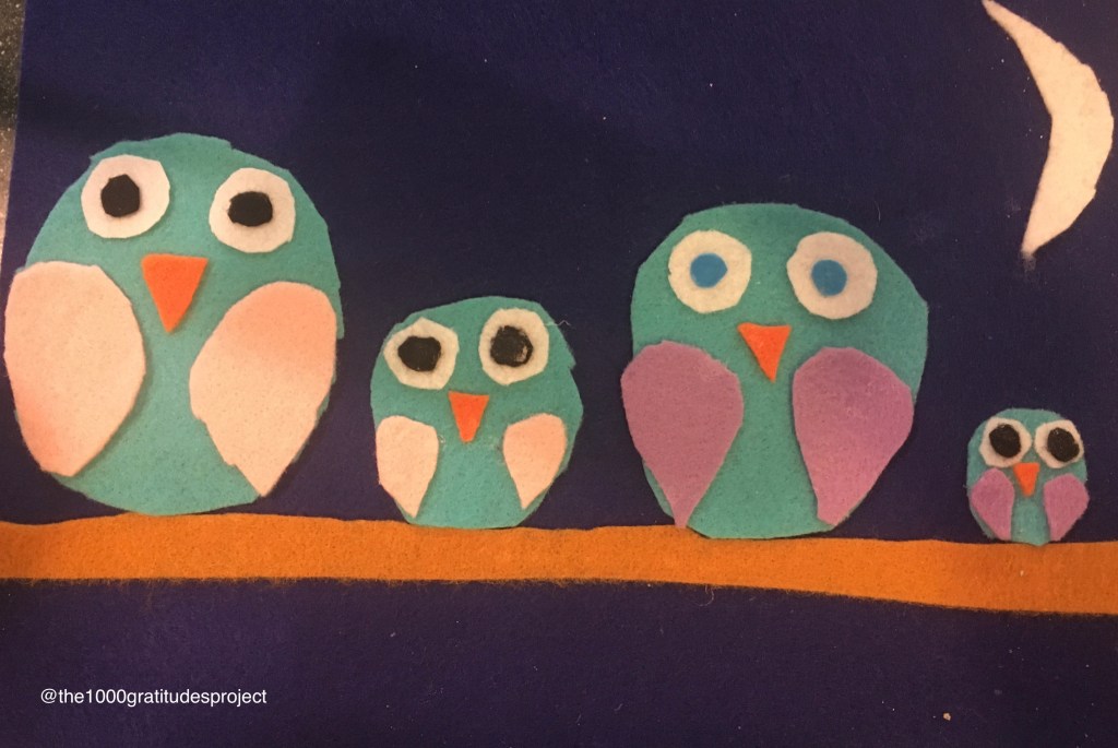 Among the 1000 gratitudes, I am grateful for my family – years ago, my older daughter made this “portrait” with some felt she had leftover from another project. I’ve always felt like it kind of captures some aspect of each us – the dad owl looks like the rock that her father is, her own owl looks like she’s in a rush to get somewhere to work on something else (yes! she always is!), the mom owl looks slightly overwhelmed ( true when my kids were those ages!), and the baby owl is just so sweet – all eyes and wings.