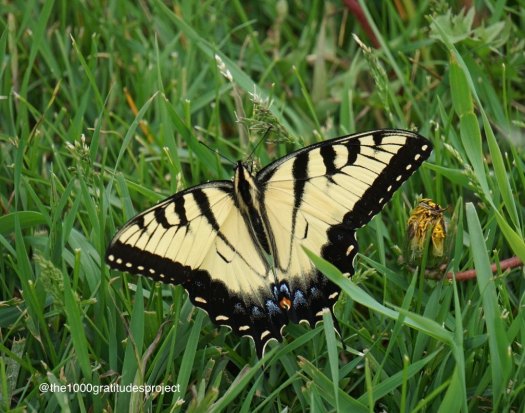This afternoon, walking the dog before a storm, we came across this yellow tiger swallowtail, perfectly still in the grass. He was so still that the world seemed to still around him – even my dog heeled and sat without me asking.