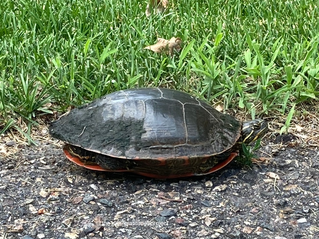 Among the thousand gratitudes, I am thankful for turtles, big and small. I originally planned to write this post about how grateful I am for the small and cranky turtles in our neighborhood, and how majestic I think they are – sort of like the ancient sea turtles (honu) we once saw in the ocean in Hawaii.